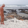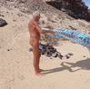 On the day that we visited there were thirty or forty people near the shanty building, but we walked away from the crowd and were able to strip off for a few photographs. It was difficult to see how to access the sea as there were many rocks offshore. Although swimming is probably not possible, it would be possible to top up the allover tan away from the crowd.
